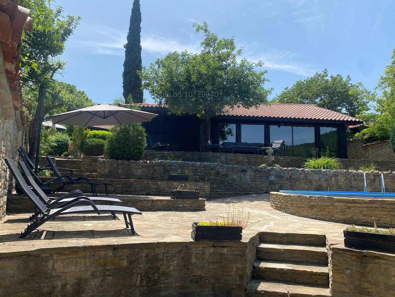 - сезонен басейн (5 м диаметър/1,5 м дълбочина) с шезлонги и кът за отдих;
