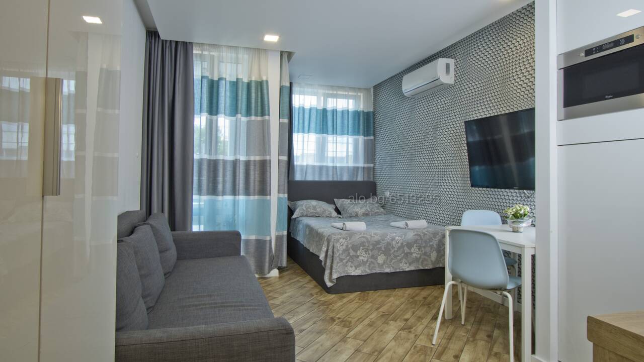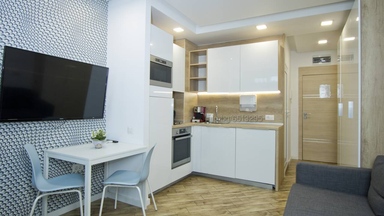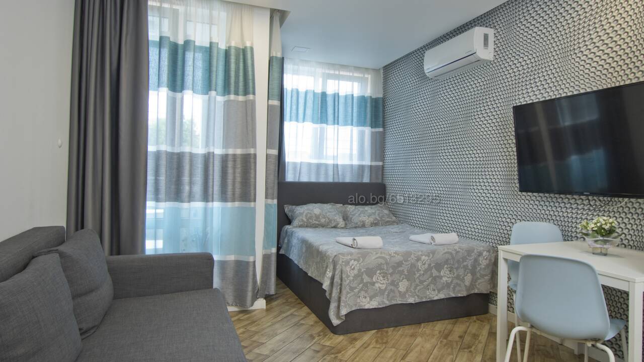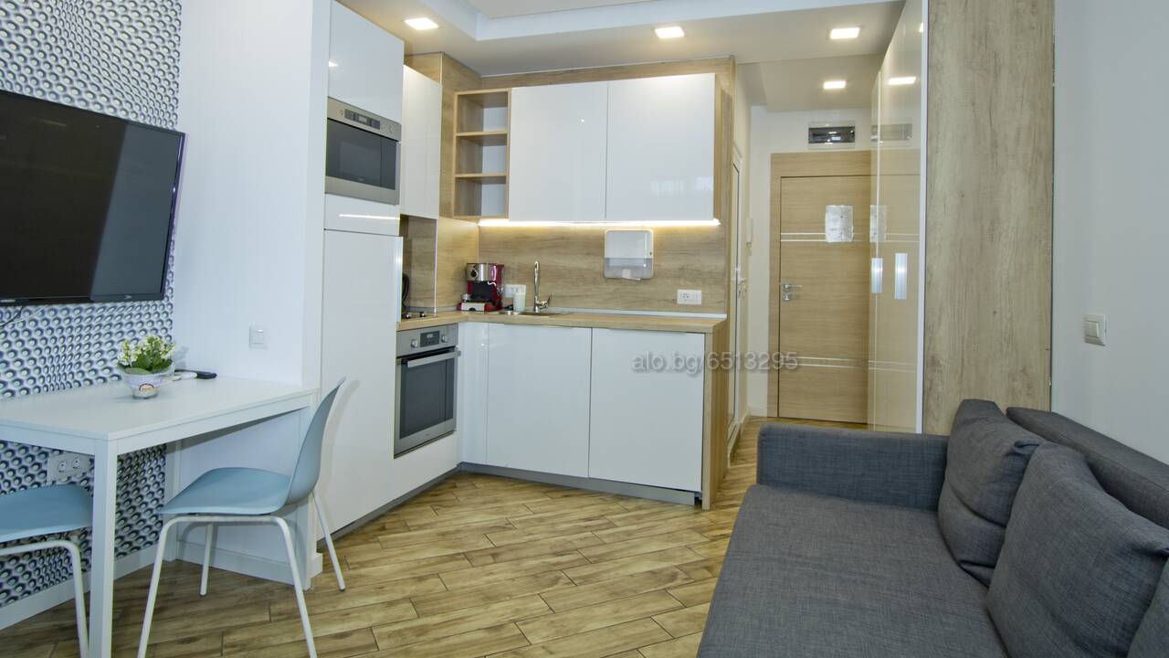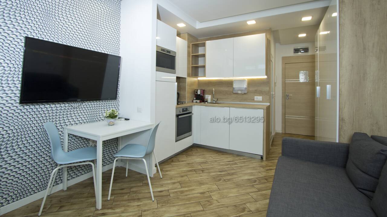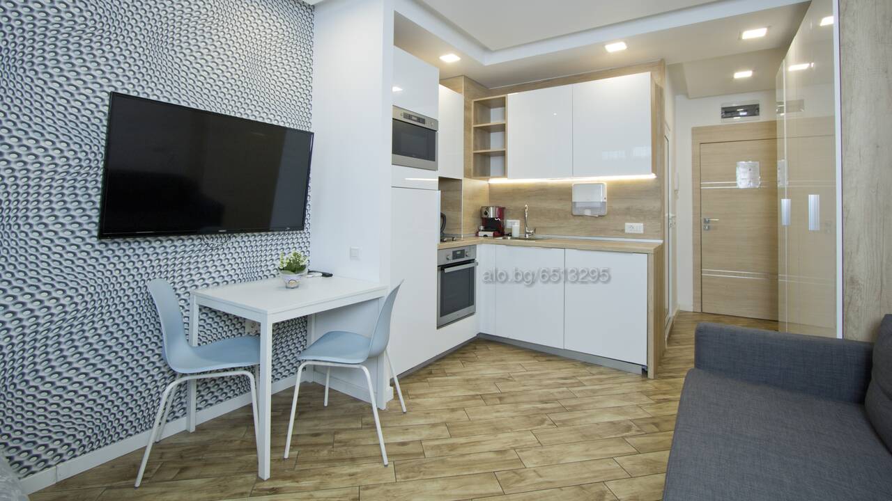 Апартамент разполага със спалня, кухня - обособена със микровълнова печка, готварска фурна с котлони, пералня, хладилник, кухненски прибори и принадлежности. Климатик. Апартаментите разполагат с 43 инчов смарт телевизор и бърз интернет.