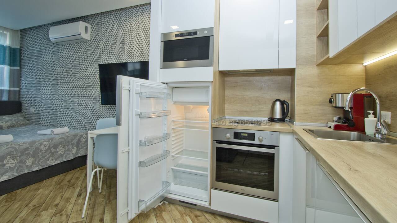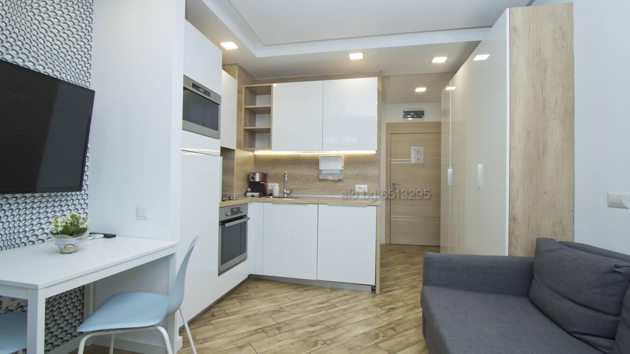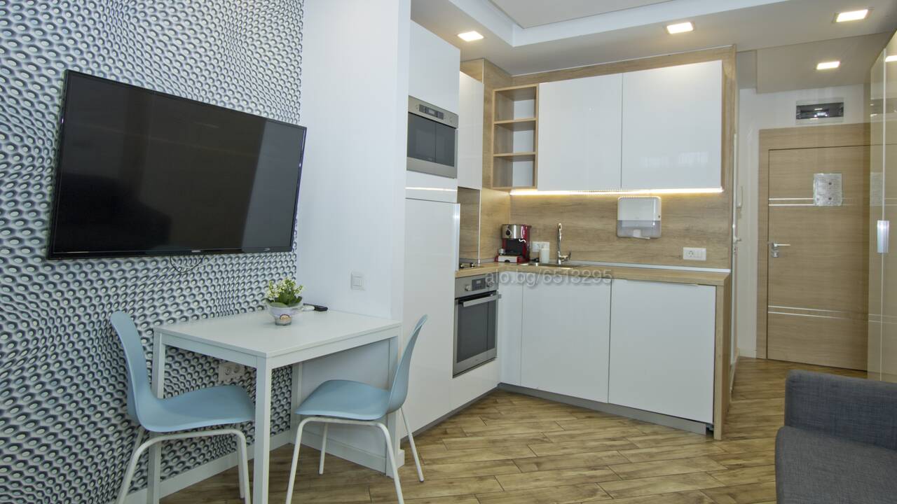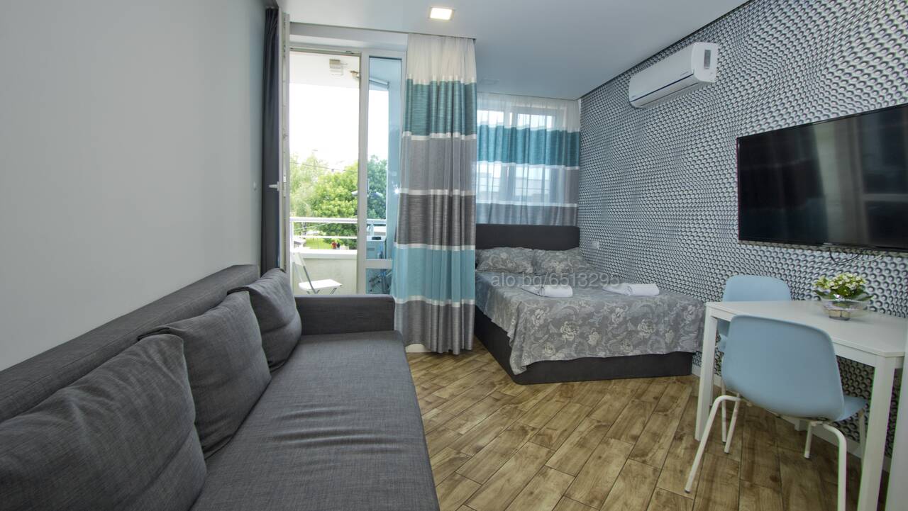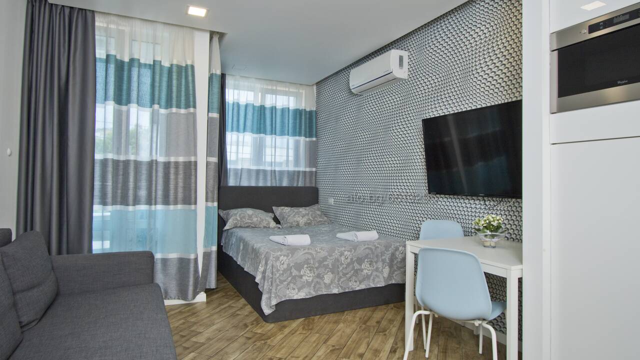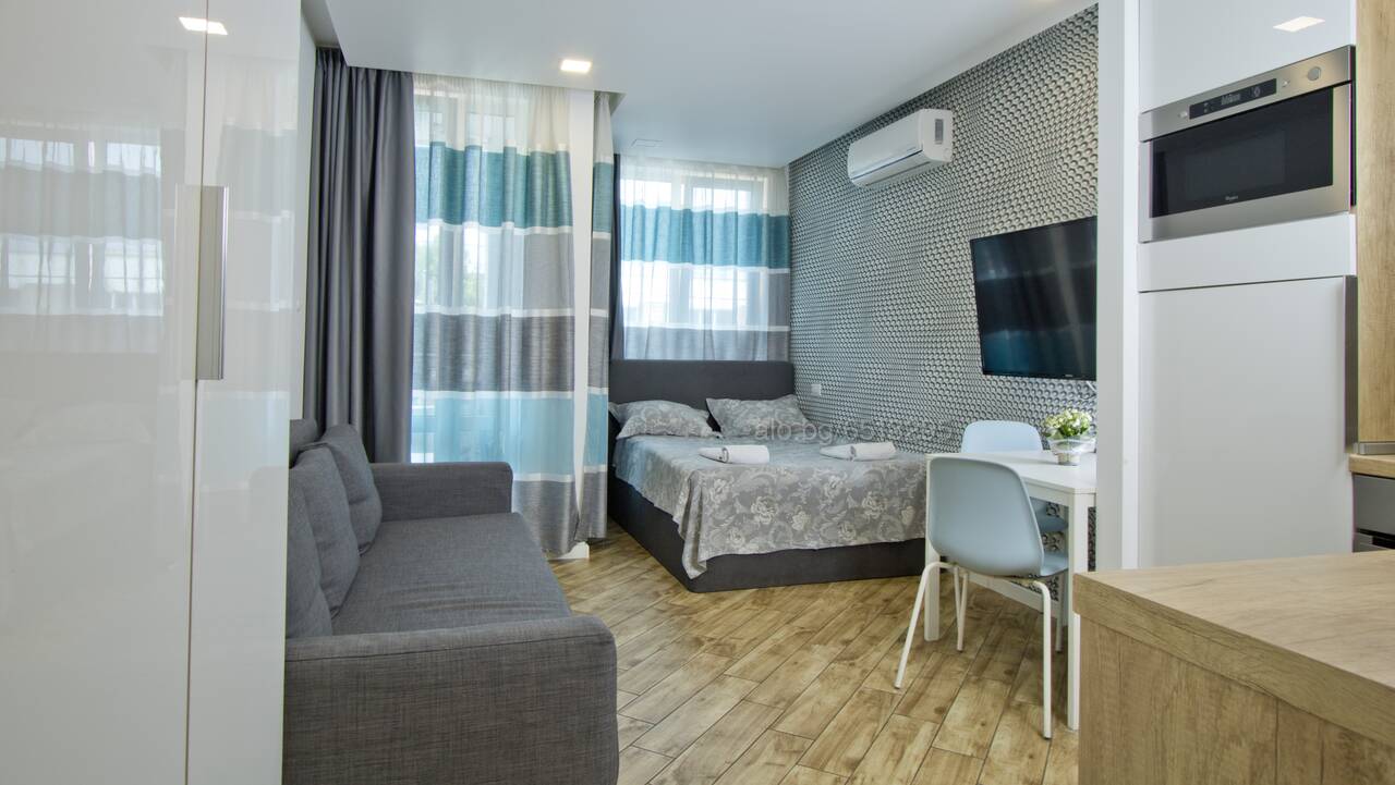 Апартамент разполага със спалня, кухня - обособена със микровълнова печка, готварска фурна с котлони, пералня, хладилник, кухненски прибори и принадлежности. Климатик. Апартаментите разполагат с 43 инчов смарт телевизор и бърз интернет.