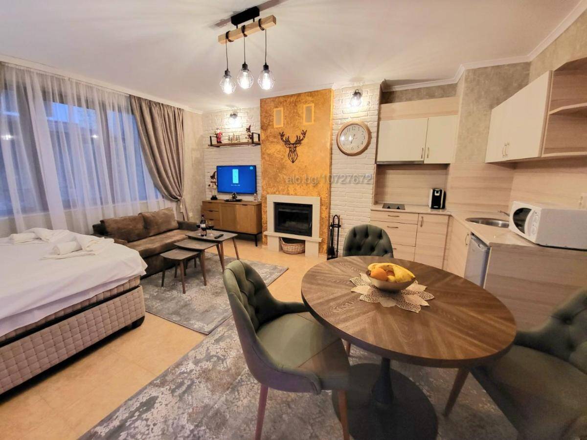 Получавате студиото от снимките. В него могат да отседнат до 2+1 човека. Уютно обзаведено, с едно помещение състоящо се от антре, баня, всекидневна с напълно оборудвана кухна. В стаята има голямо двойно легло и удобно разтегателно канапе, кухненският кът е оборудван с аспиратор, керамични котлони, хладилник, кафе-машина (за мляно кафе), ел. кана и цялата необходима посуда за приготвяне на храна, трапезна маса с 4 стола, 1 бр. Smart телевизор с кабелна телевизия. Отоплението е решено с ел. конвекторен радиатор и камина с дърва за уют.