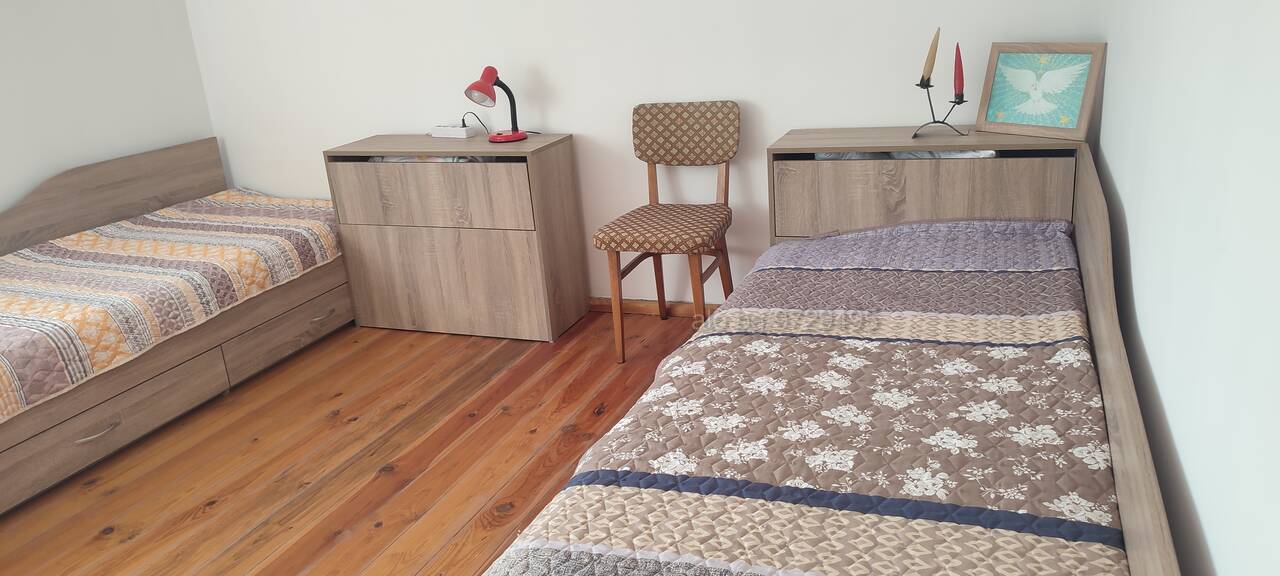 Предлагаме три стаи на горния етаж на къщата, като сме запазили първоначалното им функционално разпределение. Подът нарочно е запазен в оригиналния си вид - дъбово дюшеме, което придава особено приятно усещане за топлина и уют. Достъпът към трите стаи е с отделен вход. Една стая е с 3 единични легла, друга е с 2 единични и с възможност за трето сгъваемо (достатъчно удобно) легло, а третата е с едно единично легло.